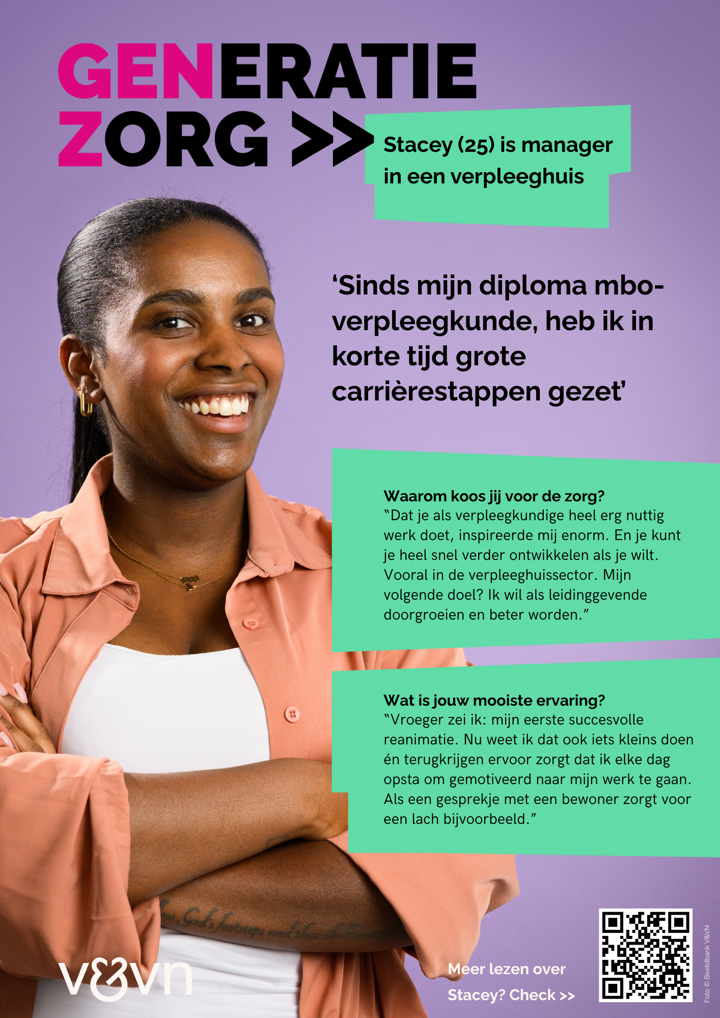 Help je mee om de jongste generatie te motiveren voor een baan in de zorg? Deel bijvoorbeeld dit portret op je eigen social-mediakanalen of geef een gastles op een basis- of middelbare school. De toolkit met lesmaterialen blijft beschikbaar. Ook kun je fysieke campagnematerialen aanvragen, zoals posters en stickers (zolang de voorraad strekt).