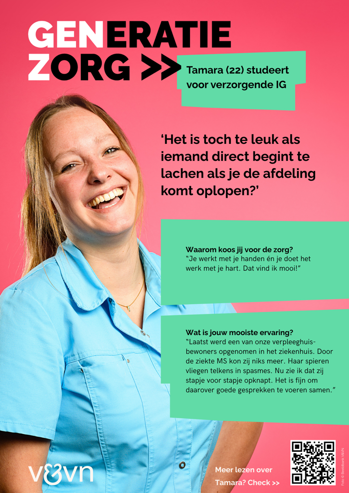 Help je mee om de jongste generatie te motiveren voor een baan in de zorg? Deel bijvoorbeeld dit portret op je eigen social-mediakanalen of geef een gastles op een basis- of middelbare school. De toolkit met lesmaterialen blijft beschikbaar. Ook kun je fysieke campagnematerialen aanvragen, zoals posters en stickers (zolang de voorraad strekt).