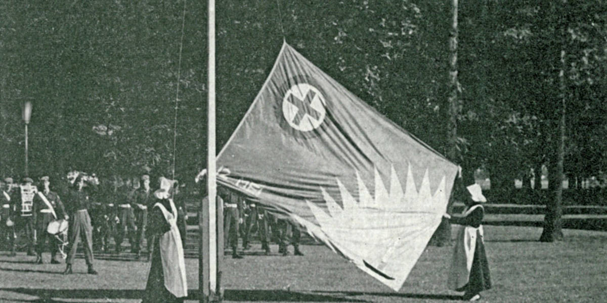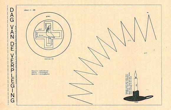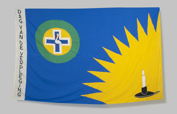 Een groep verpleegkundigen, patiënten en kijklustigen verzamelt zich rond een vlaggenmast. Twee leerling-verpleegkundigen, gekleed in een uniform uit de tijd van Florence Nightingale, lopen naar de vlaggenstok. In hun handen houden ze samen een opgevouwen vlag vast. Op de achtergrond speelt een plaatselijk tamboerkorps: een marcherend militair muziekkorps met grote trommels. Terwijl de toeschouwers ademloos toekijken, vouwen de leerling-verpleegkundigen de vlag uit. Trots kijkt de heer J.G. ter Brugge, land- en tuinbouwkundig medewerker, naar de vlag die hij heeft ontworpen. Er komt een blauwe vlag tevoorschijn. Rechtsonder staat een zon met een kaars, verwijzend naar Florence Nightingale, in het midden prijken de insigne-symbolen van de Wet ziekenverpleging A en B en de ooievaar van de kraamverpleging. Links staat van boven naar onder geschreven ‘Dag van de Verpleging’.