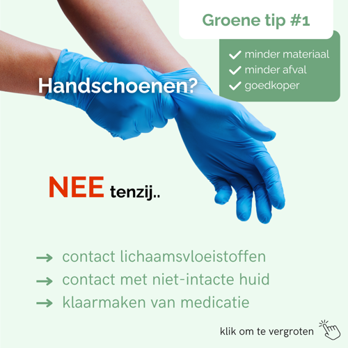 In de zorg worden dagelijks enorme aantallen handschoenen gebruikt. Vaak zijn ze onmisbaar, maar ze zijn lang niet altijd nodig. Het productieproces van handschoenen vraagt veel energie en water, en gebruikte handschoenen worden altijd als medisch afval verbrand.