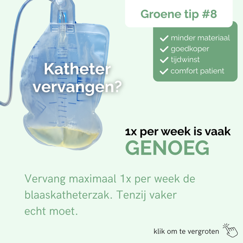 - Gebruik langer: Vervang de katheterzak pas na 7–10 dagen, tenzij er problemen zijn.