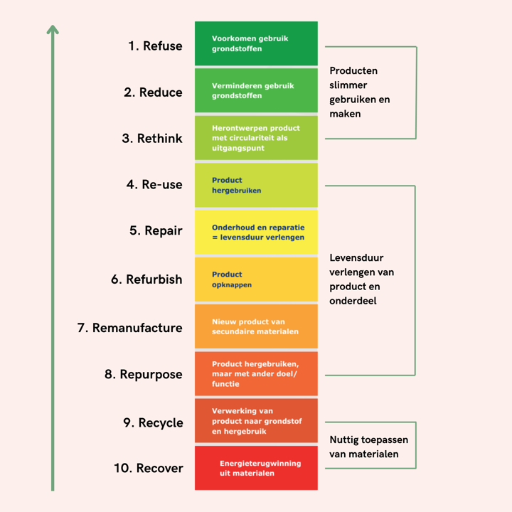 De R-ladder laat zien hoe je met materialen, werkprocessen en energie steeds slimmer en duurzamer kunt omgaan. De ladder bestaat uit 10 niveaus: van Refuse (weigeren van onnodige spullen of handelingen) tot Recover (energie of grondstoffen terugwinnen uit afval). Hoe hoger een maatregel op de ladder staat, hoe groter de impact: je voorkomt verspilling, bespaart tijd en kosten en verkleint de milieubelasting.