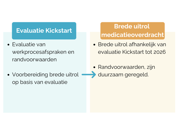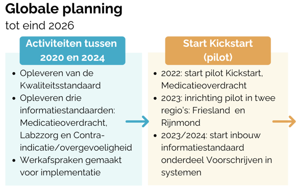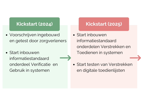 In 2021/2022 zijn werkafspraken gemaakt ter voorbereiding op de implementatie van de informatiestandaarden in de praktijk, de zogenaamde Kickstart. De Kickstart is eind 2022 gestart en is een pilot waarin twee regionale samenwerkingsverbanden organisaties, leveranciers en zorgverleners de digitale medicatieoverdracht in de praktijk testen.