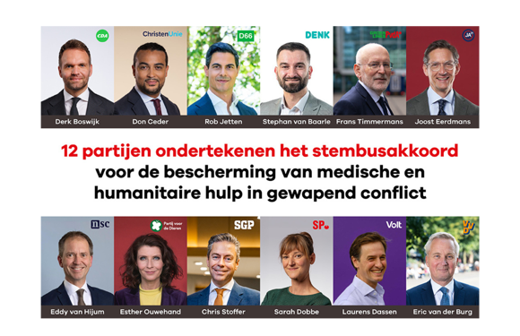 Twaalf Nederlandse politieke partijen ondertekenen vandaag een stembusakkoord voor wereldwijde bescherming van medische zorg en humanitaire hulpverleners. De initiatiefnemers hiervoor zijn de hulporganisaties Artsen zonder Grenzen en het Rode Kruis, artsenfederatie KNMG en beroepsvereniging V&VN. “Voor ons is de grens bereikt”, verklaren de organisaties.