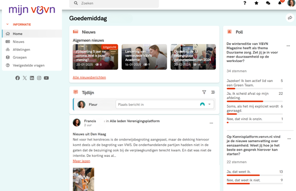 Dankzij de exclusieve artikelen op het V&VN Verenigingsplatform ben je als lid altijd op de hoogte van de laatste ontwikkelingen. Daarbij is het een belangrijke plek om je stem te laten horen en direct invloed uit te oefenen. Via open vragen en polls wordt er regelmatig informatie opgehaald ter voorbereiding van bijvoorbeeld tafelgesprekken met ministers.